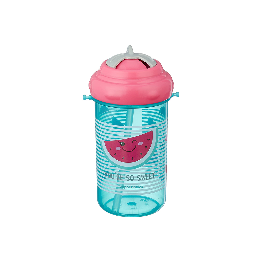 Practical color bottle with a silicone non-pouring straw and a juicy watermelon imprint is designed for children over 12 months of age who already know how to drink themselves. Ideal for traveling or walking. Volume 400 ml. The bottle does not contain BPA.