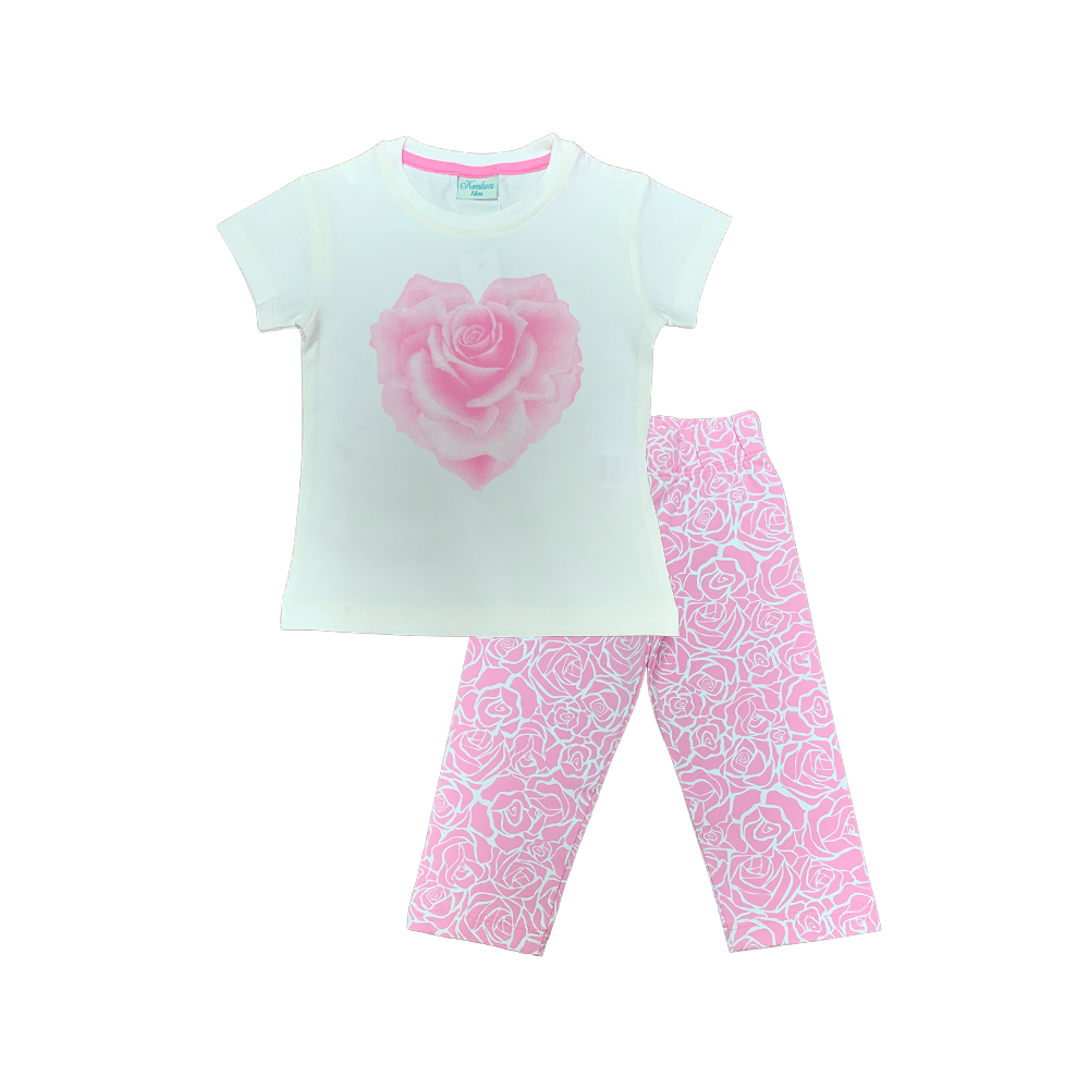 Girl’s summer set with rose print, consisting of two pieces, a cotton t-shirt with short-sleeves, and comfortable legging pants for movement, We will help you with the Komkom baby summer collection to Add A Touch Of Sophistication To Your Girl’s Wardrobe.